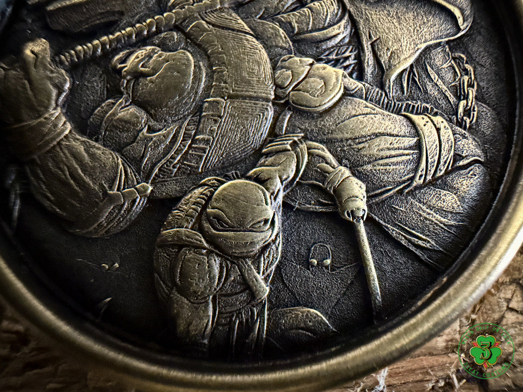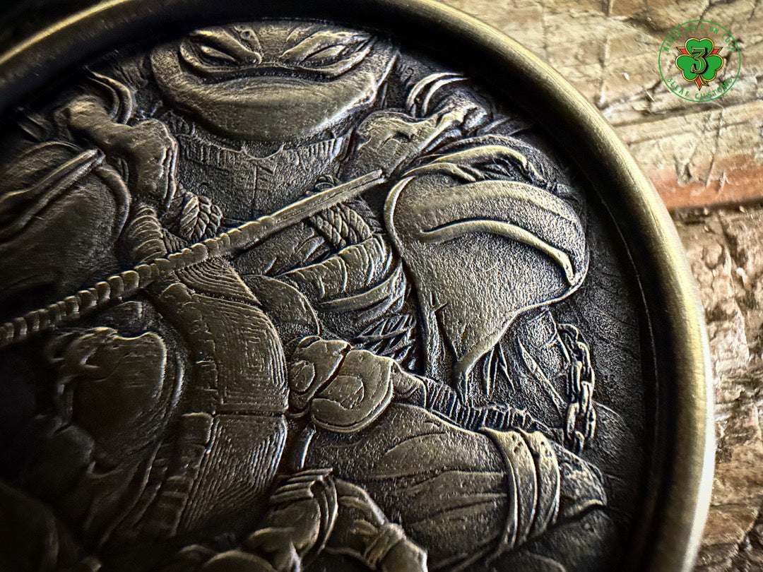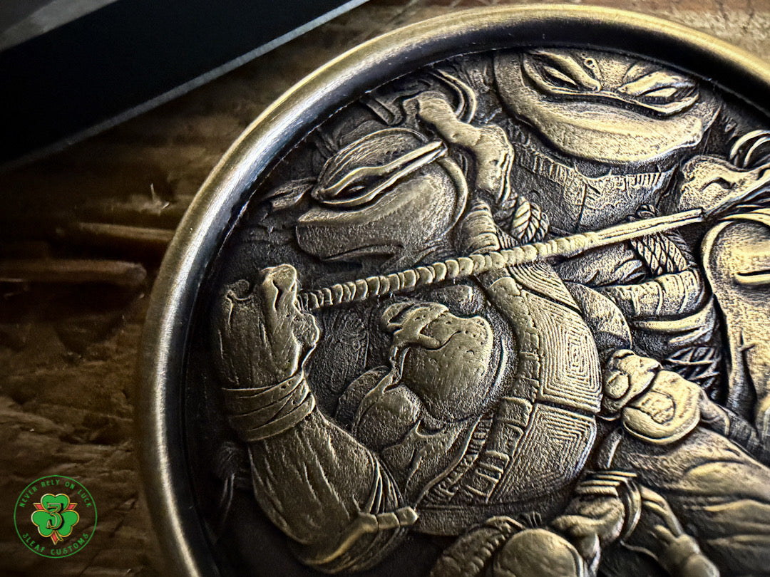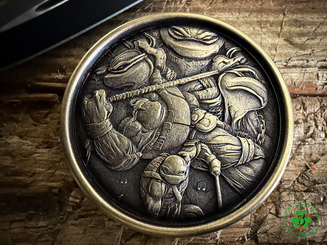 This piece is made from 100% solid brass. The front face has been engraved with some very cool TMNT themed artwork, featuring all of the Turtles. The artwork has an immense amount of detail and has been rendered from a 2D illustration into a 3D design for engraving. The opposing side of this CUE has been 3D engraved with some artwork that I put together featuring a manhole/sewer cover as a background, and the TMNT logo atop. On the outer edge of the CUE is "Turtle Power" in a TMNT themed font, and "01" with the 2026 year marking (Horseshoe & Clover).