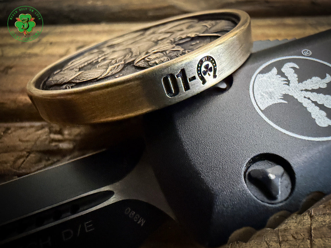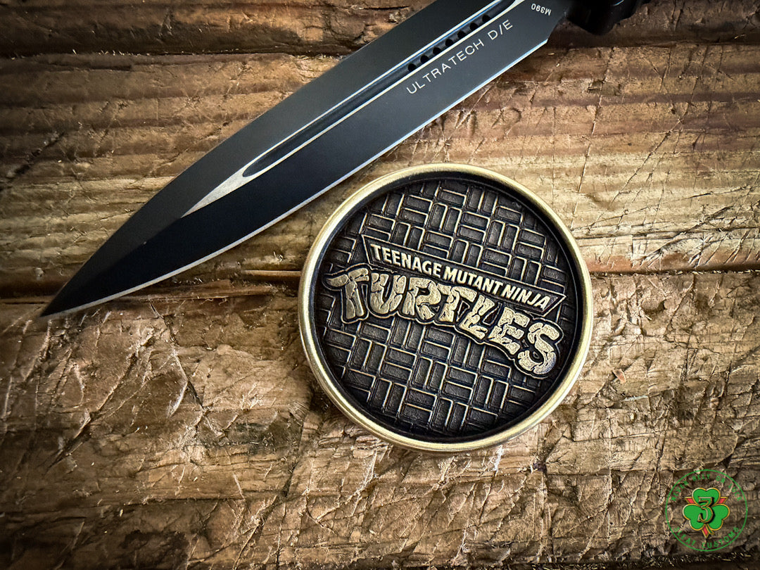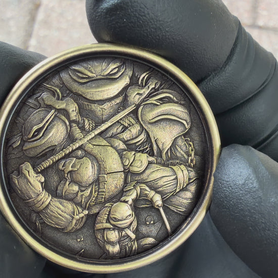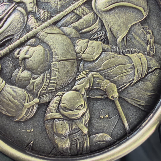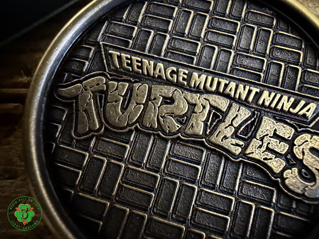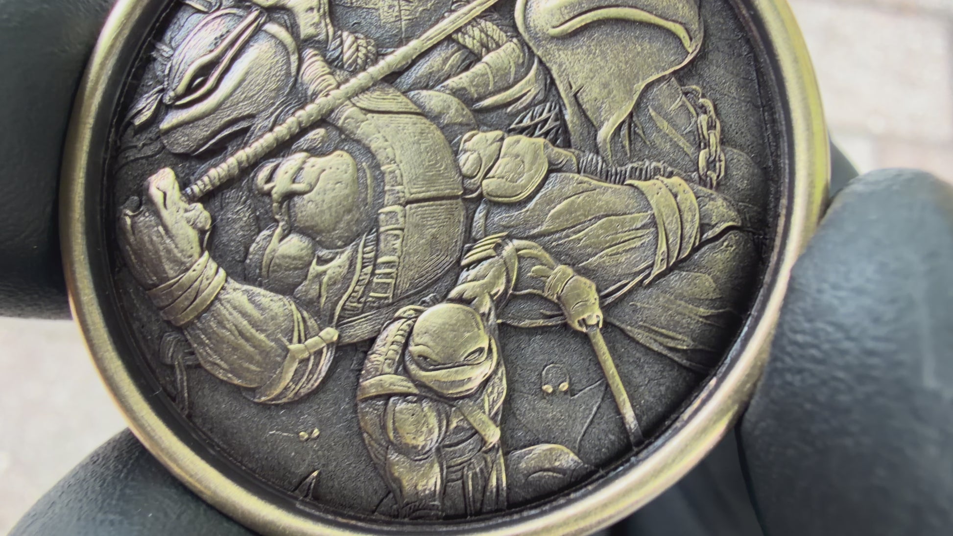 This piece is made from 100% solid brass. The front face has been engraved with some very cool TMNT themed artwork, featuring all of the Turtles. The artwork has an immense amount of detail and has been rendered from a 2D illustration into a 3D design for engraving. The opposing side of this CUE has been 3D engraved with some artwork that I put together featuring a manhole/sewer cover as a background, and the TMNT logo atop. On the outer edge of the CUE is "Turtle Power" in a TMNT themed font, and "01" with the 2026 year marking (Horseshoe & Clover).
