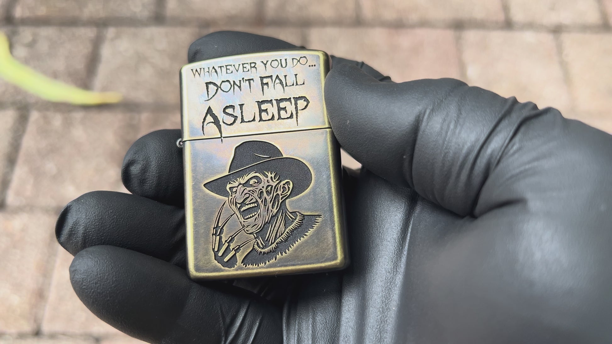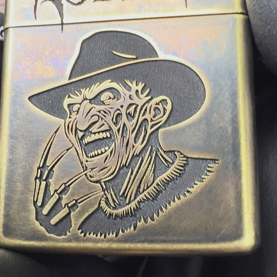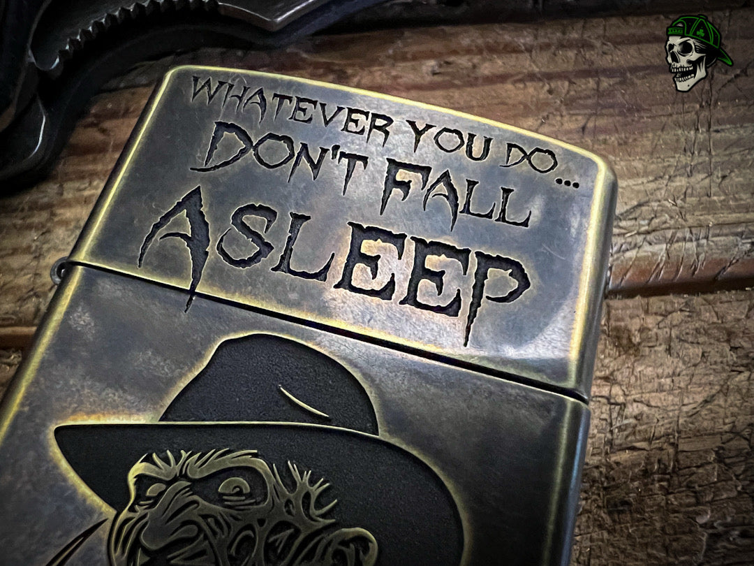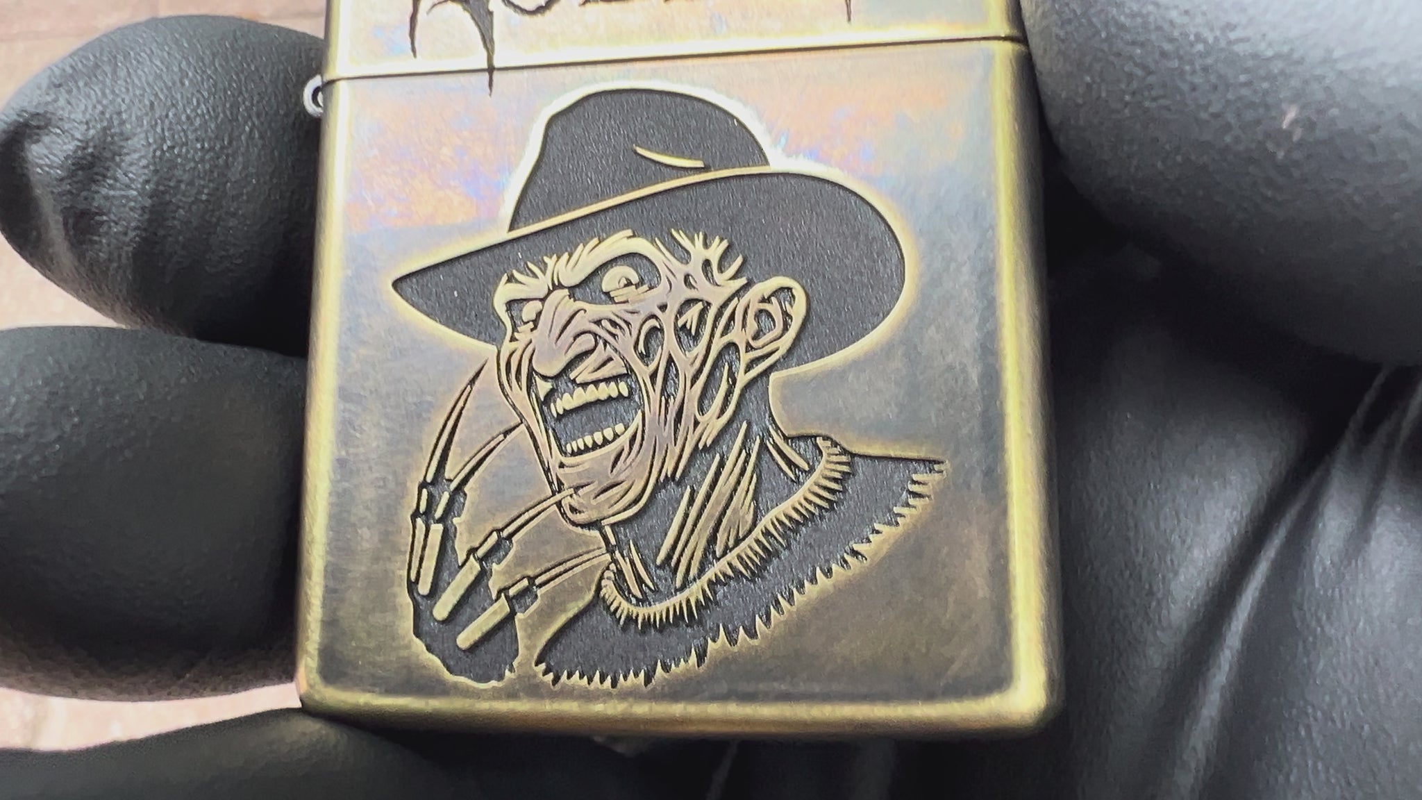 The lighter is a genuine Solid Brass Zippo Armor Case, which are 1.5 times thicker (stock) than that of their standard offering. Originally coming from the factory with a tumbled finish, I gave this a DEEP ENGRAVING on both sides. The front features "Freddy" with his claws out and the words, "Whatever you do... Don't fall asleep". The back side of the Zippo is another quote from the screen, "If you die in your dreams, you die for real!"