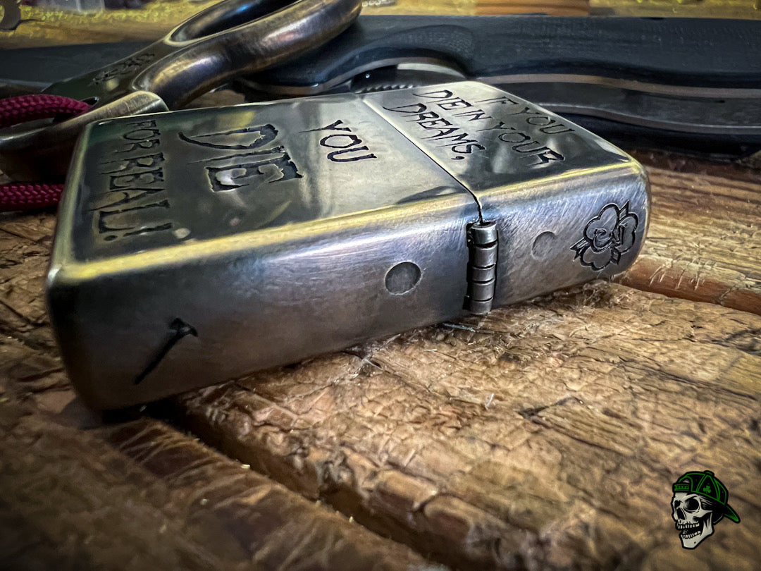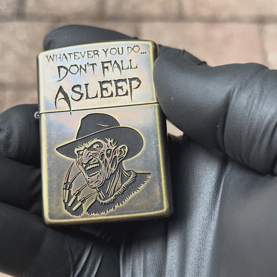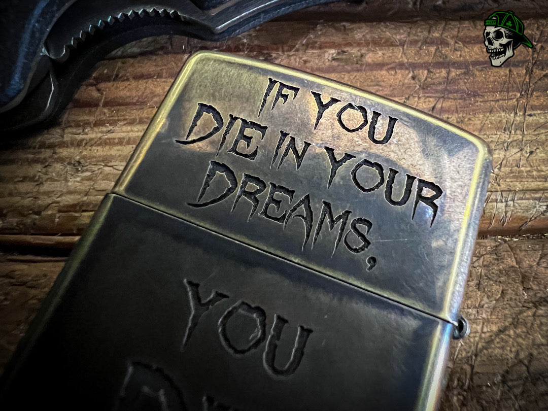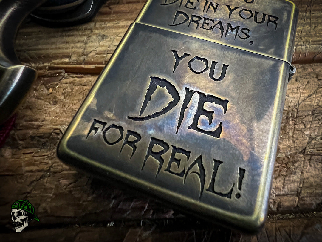 The lighter is a genuine Solid Brass Zippo Armor Case, which are 1.5 times thicker (stock) than that of their standard offering. Originally coming from the factory with a tumbled finish, I gave this a DEEP ENGRAVING on both sides. The front features "Freddy" with his claws out and the words, "Whatever you do... Don't fall asleep". The back side of the Zippo is another quote from the screen, "If you die in your dreams, you die for real!"