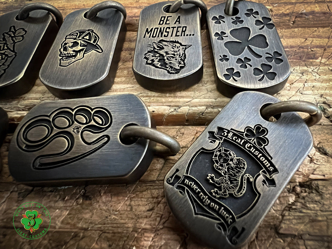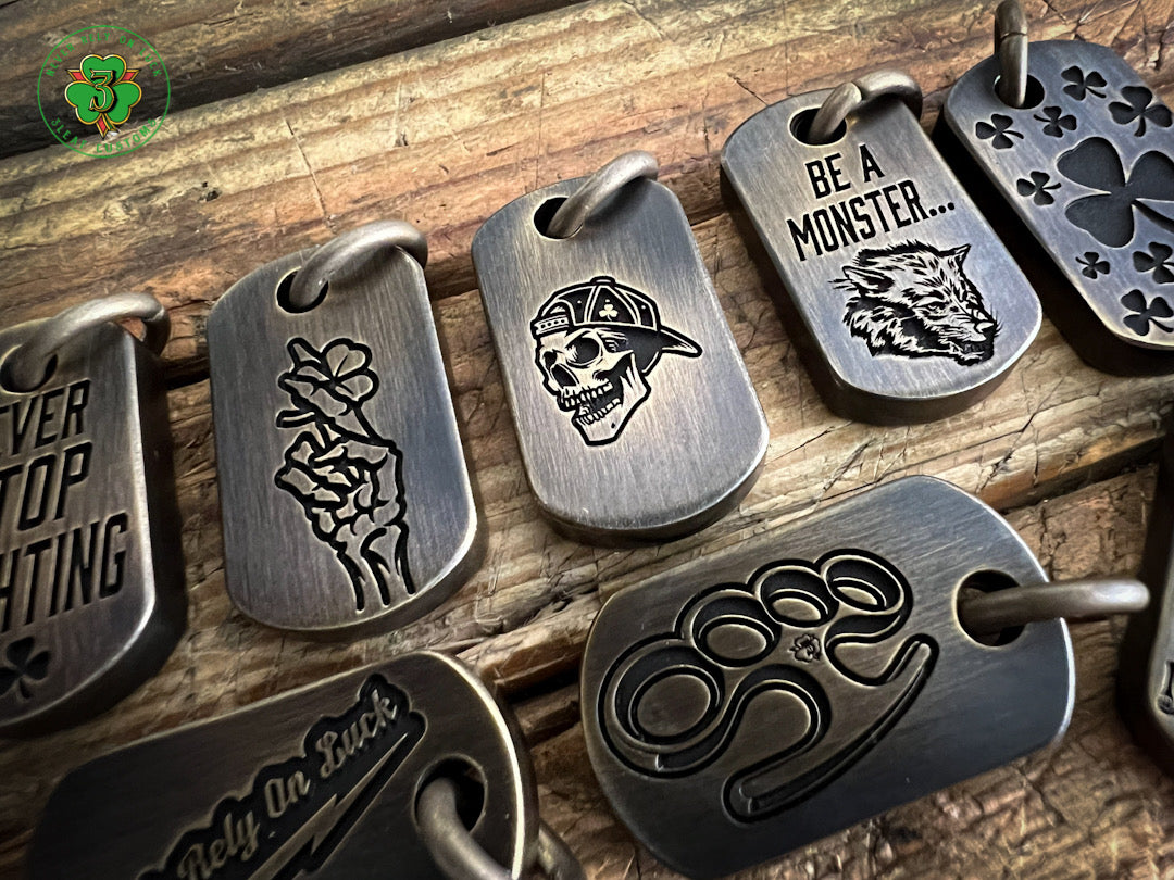 Many of these have been engraved with special/limited markings reserved for auction pieces, which under normal circumstances go for a larger end price. To keep things fair and enable everyone to have an opportunity to own a 3Leaf product without engaging in an auction, Tags will be randomly placed into packages. Please DO NOT request a specific design. In the end, this also has encouraged trading among members of the "No Luck Club". You may get a number not featured in the pictures, as there have been doubles made of each design. Due to the hand finishing process, no two pieces will be exactly alike.