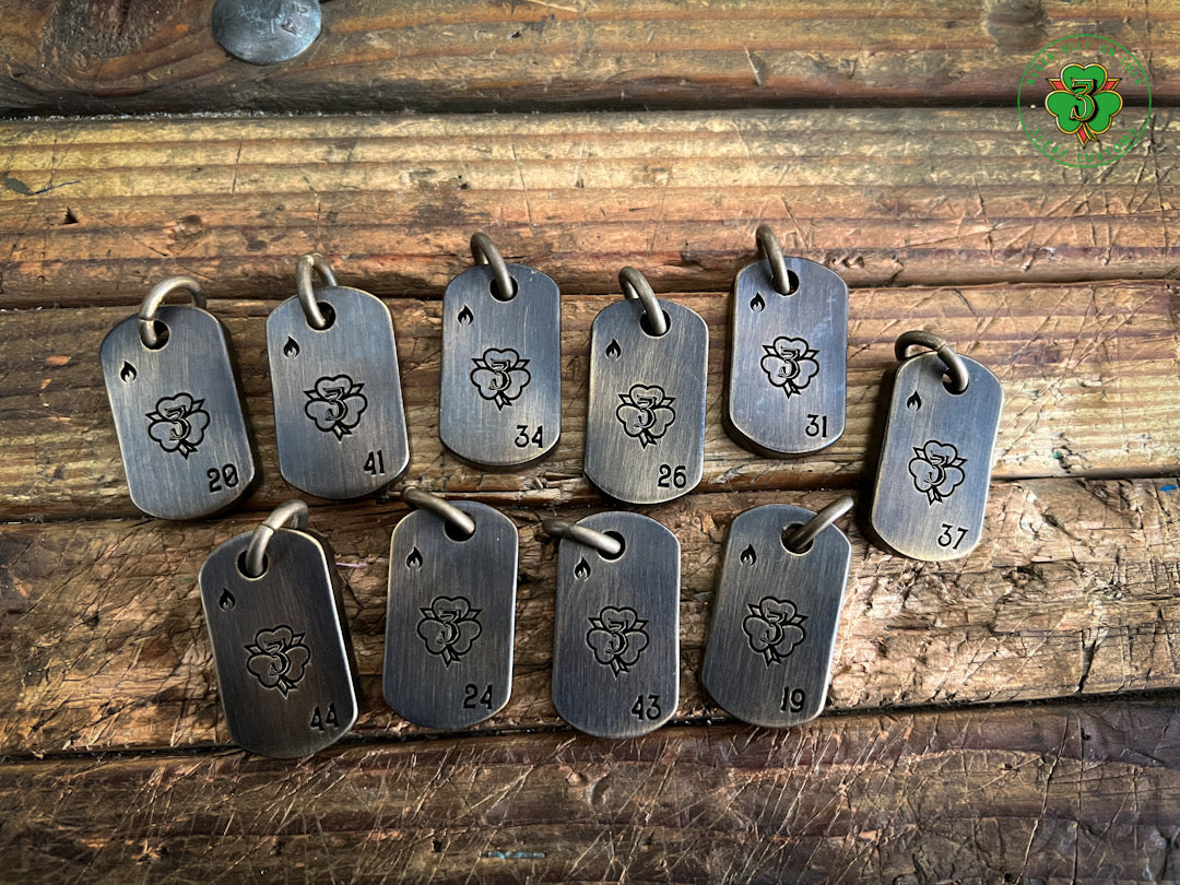 The front face of the Imminent Danger Tag features my OG (original) logo with the serial number and the 2024 year marking (Lantern Flame). The opposing faces are marked with various logos or artwork that I own or can relate to. Instead of placing the. All pieces have Odie’s Oil applied to help preserve and richen the look.