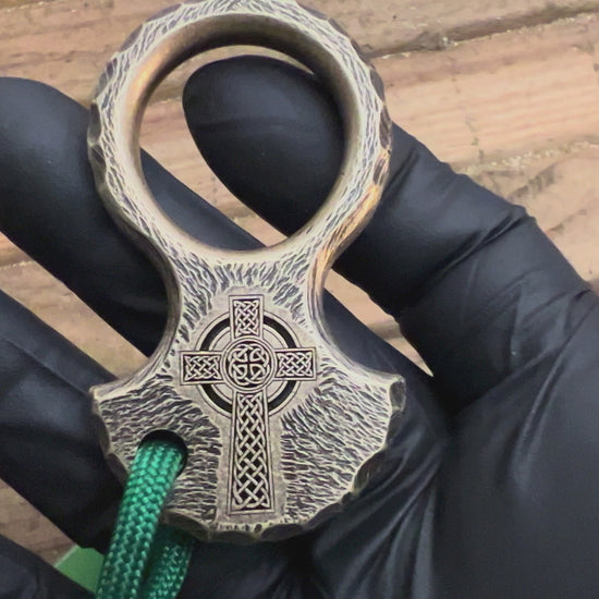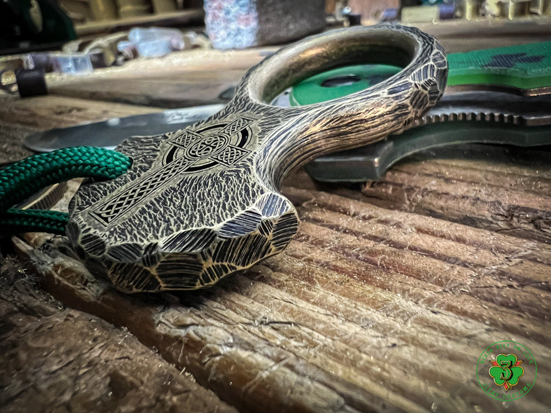 The finger stall is an industry standard 1" with a slight oval drop to the floor, assisting the finger in a more natural seating. The entirety of the Charm has been hand sanded to remove any machining marks. One face features the OG (original) 3LC logo and "Conquer All" engraved at the bottom, while the opposing face has a beautiful Celtic Cross deeply engraved into the center.